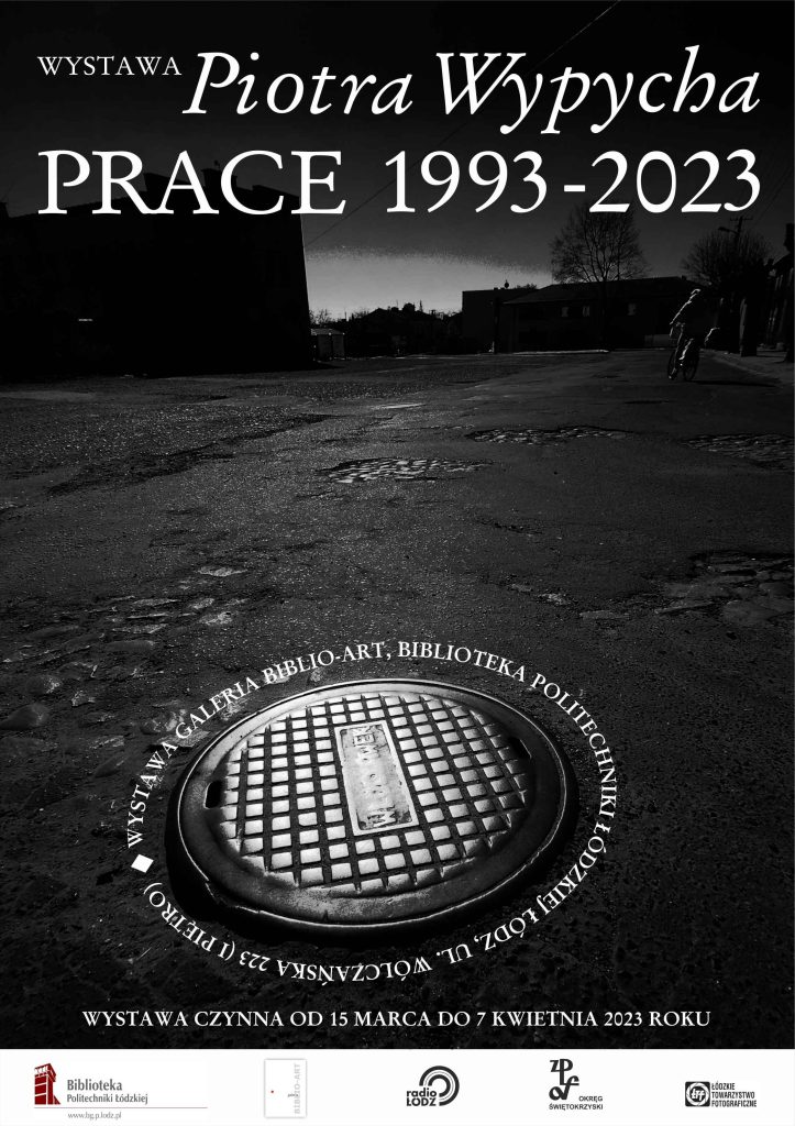 Piotr Wypych. Prace 1993-2023. Wystawa dr Piotra Wypycha pt. „Prace 1993 – 2023” jest próbą podsumowania 30. letniej twórczości tego artysty grafika i artysty fotografika. Piotr Wypych jak pisał Paweł Pierściński to „człowiek o renesansowych zainteresowaniach” – zajmuje się fotografią abstrakcyjną, architektury, dokumentem fotograficznym, portretem, foto/montażem jak i fotografią pejzażu. Artysta rzeźbi, rysuje i oddaje się projektowaniu graficznemu, uprawia również precyzyjne ilustratorstwo atlasowe. To wszystko – albo raczej namiastkę wielorakich twórczych zainteresowań Piotra Wypycha znaleźć możemy na kilkudziesięciu wydrukach na materiale pcv o rożnych wymiarach. Należy stwierdzić iż przeważa fotografia, a inne realizacje są jej podporządkowane. Warto skupić się na największych kilkunastu planszach gdzie autor zestawił swe projekty – rzeźby, plakatu, ilustratorstwa i książek – albumów fotograficznych. Zwracają uwagę duże zdjęcia w kolorze, gdzie u dołu widnieją okładki książek z których zapewne pochodzą, autor od wielu lat projektował plakaty dla Międzynarodowego Festiwalu Sztuki Akcji „Interakcje”, czy wykonywał precyzyjne ilustracje zwierząt i architektury do wydawnictw – co możemy na kilku panelach wystawowych zobaczyć. Ciekawa jest seria 30. fotografii zawartej w kwadratowych formatach – jest to swoiste pokazanie drogi i rozwoju w sztuce fotografii Piotra Wypycha – eksponowane są tu zdjęcia z początku lat 90. XX wieku, aż do najnowszego obrazu fotograficznego z 2023 roku. Autor również we fragmentach pokazuje swe najważniejsze cykle fotograficzne: „Szły na wschód bataliony, szwadrony i pułki…”, „Kamienie krzyczeć będą”, „Krajobrazy nierzeczywiste”, „Sto prac z życia foto/grafika”, „Łódzkie od świtu do zmierzchu” czy albumowe „Drzewa ziemi łódzkiej”. Całość prac mimo wielkiej różnorodności, łączy nam się w jedno – w portret artysty. Można z całą pewnością napisać, iż 30. lat pracy twórczej, to dla dr Piotra Wypycha – czas przeszły nie zmarnowany.