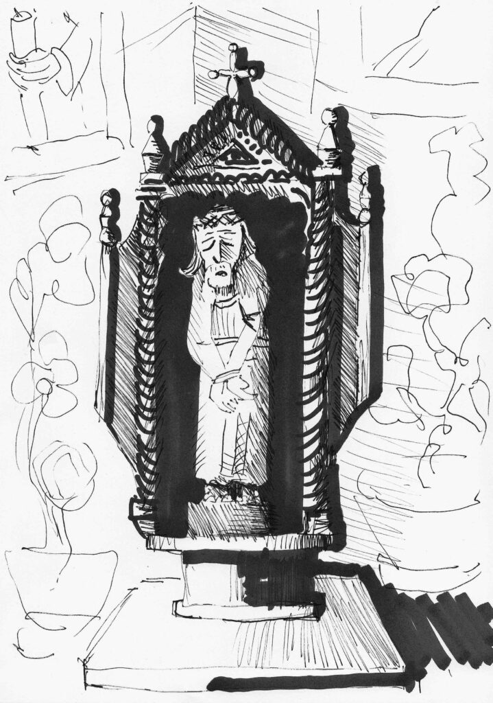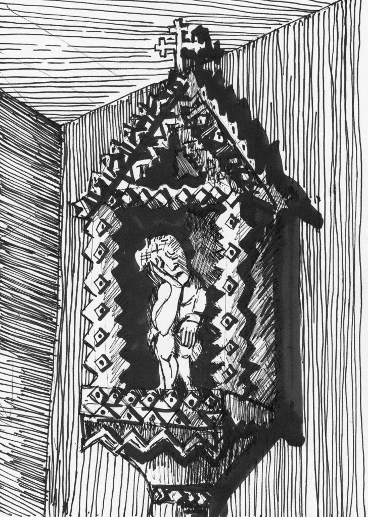 To projekt zrealizowany z moim przyjacielem Andrzejem Białkowskim i wieloma znamienitymi autorami tekstów. „Andrzej Białkowski i Piotr Wypych, autorzy projektu Ikonosfera hierofanii (www.ikonosferahierofanii.pl), stawiają sobie cel, który z jednej strony jest klasycznym problemem w antropologii, bowiem dotyczy religijności ludowej czy tradycyjnej oraz jej obrazowania. Autorzy jednak idą o krok dalej, chcą to uczynić w przestrzeni domowego zacisza, a robią to przez szczególny fotoraport domowych ołtarzy, obrazują obrazy domowego sacrum. Nie tylko sztuka, lecz także i współczesna humanistyka sięga po fotografię z jednej strony, aby dokumentować z drugiej, aby móc pełniej wypowiedzieć się o rzeczywistości, bowiem fotografia ma także walor interpretacyjny. Jednocześnie może nasuwać się pytanie, po cóż słowa, skoro kultura współczesna podpowiada nam właśnie takie rozwiązanie. Zatem powtórzę: być może lepiej obrazować niż opowiadać o obrazach. Niemniej obrazy domagają się słowa i, jak starałem się przekonać, wzajemnie się do siebie odwołują, zresztą fotografia, czy szerzej – sfera wizualna, ma wieloraki sens interpretacyjny…”. /Jarosław Eichstaedt, Ikonosfera i współczesna religijność/. Poniżej parę rysunków – szybkich szkiców mego autorstwa.